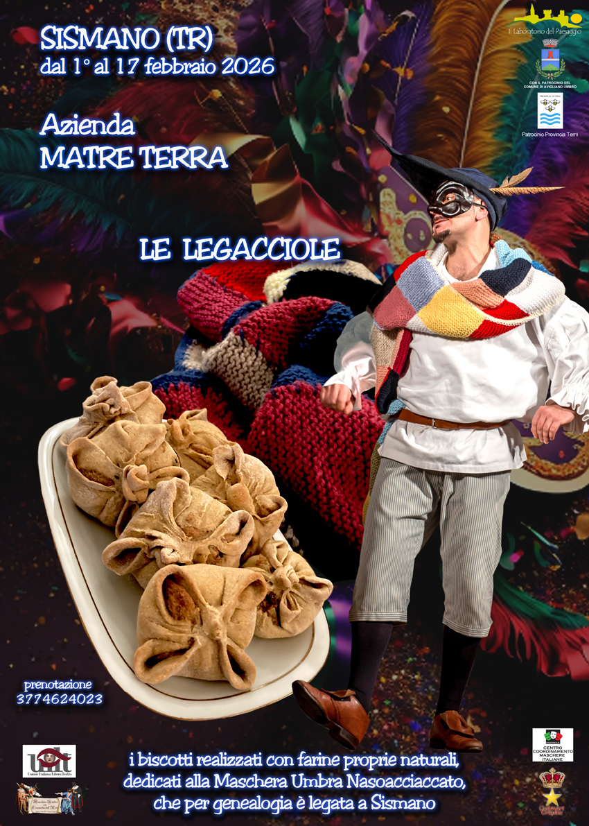 biscotti realizzati con farine proprie naturali, dedicati alla Maschera Umbra Nasoacciaccato, che per genealogia è legata a Sismano